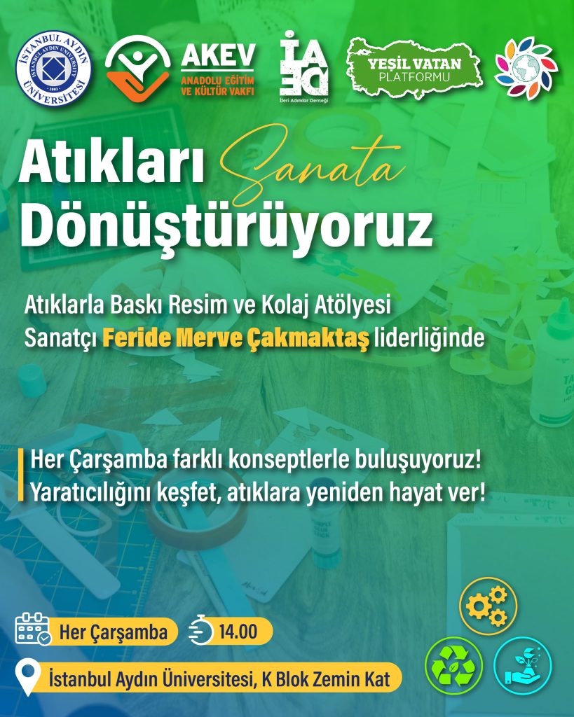 İstanbul Aydın Üniversitesi, Anadolu Eğitim ve Kültür Vakfı (AKEV), İleri Adımlar Derneği ve Yeşil Vatan Platformu iş birliğinde yürütülen “Atıkları Sanata Dönüştürüyoruz” projesi kapsamında düzenlenen ileri dönüşüm atölyeleri her hafta farklı isimlerle devam ediyor.