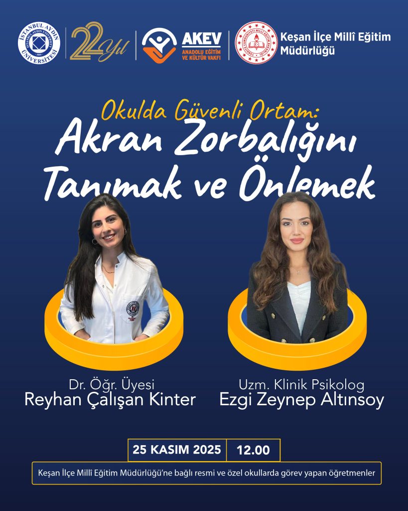 On November 25, 2025, a webinar titled “Creating a Safe School Environment: Recognizing and Preventing Peer Bullying” will be held for teachers affiliated with the Keşan District Directorate of National Education.
