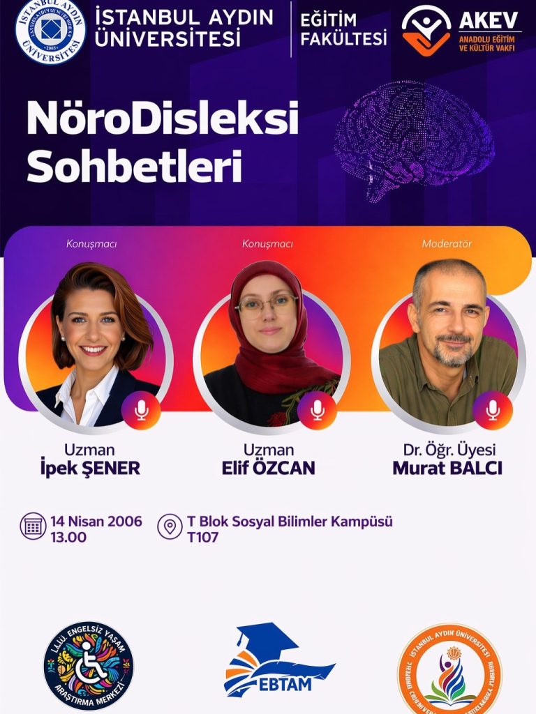 The “NeuroDyslexia Talks” event, organized in collaboration with the Faculty of Education at Istanbul Aydın University and the Anadolu Education and Culture Foundation (AKEV), was successfully held with strong participation. The event aimed to raise awareness about neurodyslexia and brought together experts in the field who shared their knowledge and experiences with attendees.