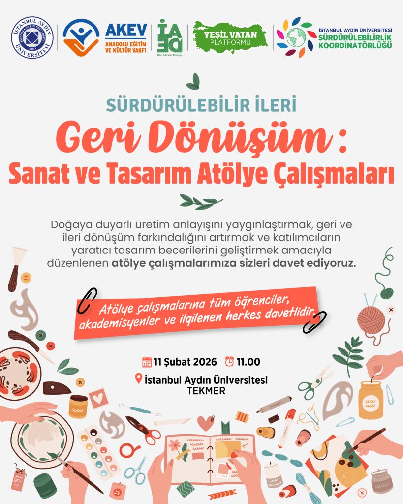 The “Sustainable Upcycling: Art and Design Workshop Series”, organized in collaboration with Istanbul Aydın University, Anadolu Education and Culture Foundation (AKEV), İleri Adımlar Association, Yeşil Vatan Platform, and the IAU Sustainability Coordination Office, brings participants together to promote an environmentally responsible production approach.